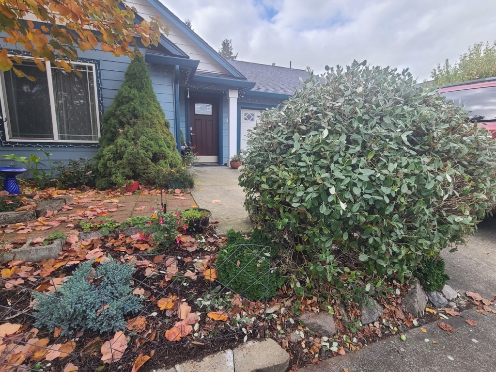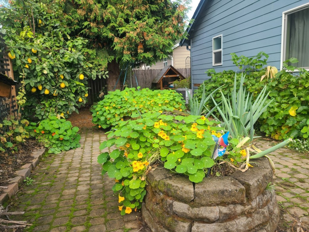 Grandma’s Backyard Gardens, in part, mid-October 2023–left to right in view: quince tree, cedar tree, nasturtiums & onions in raised bed, bunny barn back there no longer in habited by bunny (now garden gear), grapes along the house.